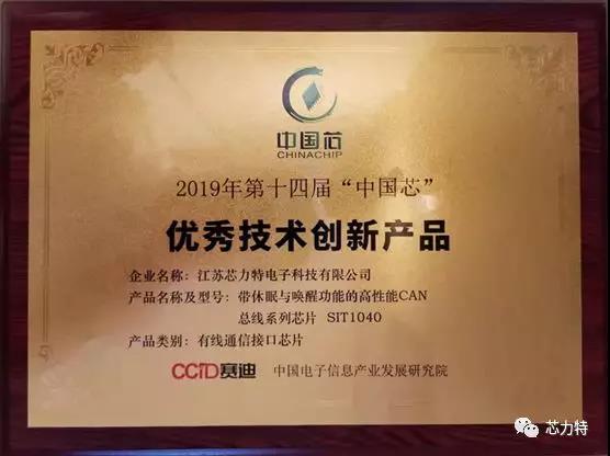 2019年10月25日,“中國芯”第十四屆集成電路產(chǎn)業(yè)促進大會在青島舉行。在會上公布了“中國芯”優(yōu)秀產(chǎn)品征集的結(jié)果。芯力特有線通信接口芯片:帶休眠與喚醒功能的高性能CAN總線芯片SIT1040,榮獲“優(yōu)秀技術創(chuàng)新產(chǎn)品”,是本次“中國芯”大獎評比在有線通信接口領域僅有的1顆獲獎芯片!