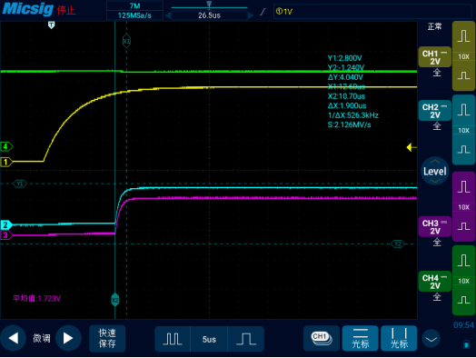 其中部分測試波形如下:(示波器通道1(黃色)接VIO,通道4(綠色)接VCC,通道2(藍色)CANH,通道3(紫色)接CANL)